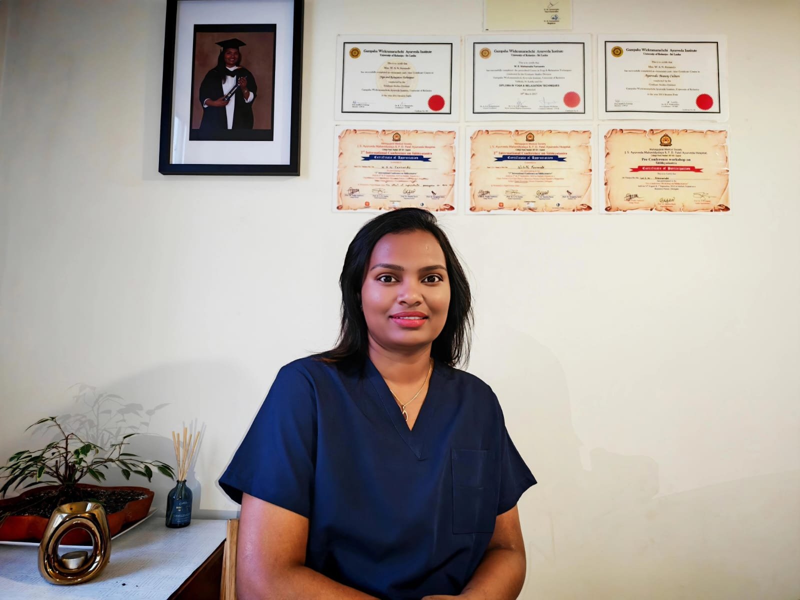 Dr. W.S.N. Fernando is an experienced Ayurvedic practitioner with a BAMS (Kelaniya), MSc in Medical Imaging (UK), PGD in Surgery, and a Diploma in Yoga. She combines traditional Ayurvedic wisdom with modern medical knowledge to provide holistic, personalized care focused on health, wellness, and prevention.